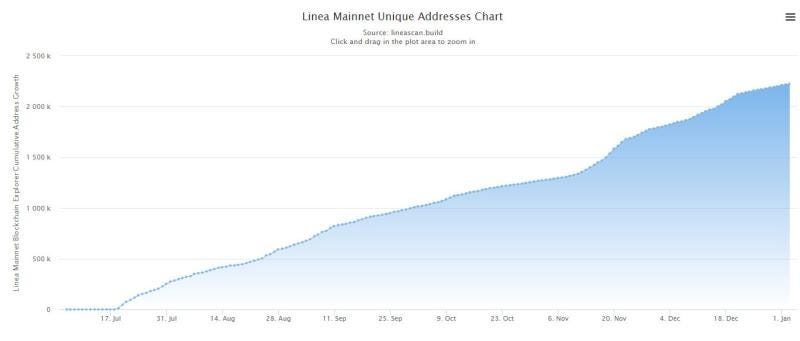 Linea launched on mainnet during ETHCC Paris 2023. Starting its journey with 100+ dapps on the mainnet gave it strong momentum out of the gate. Looking at the data, we can see it reached around 2 million unique addresses since launch.